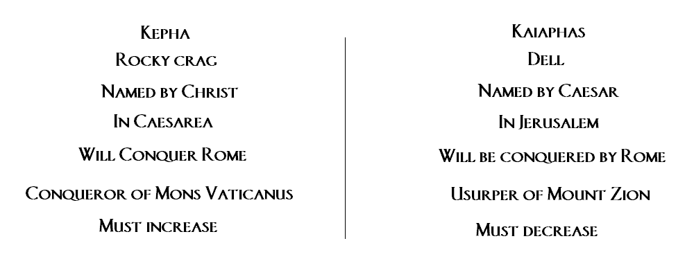 Back in Jerusalem the Roman Consul has intervened to limit the duration of the office of the High Priest. Orders from Rome demand that the males of the family of Annas (the authentic High Priest) rotate serving as High Priests for one year at a time. That year the top priestly authority rests on Kaiaphas, Annas’ son in law. (John 11:51) There is a phonetic similarity between Kaiaphas and Kepha, but the words are also morphological opposites. Kaiaphas means “a dell, or depression” while Kepha means a “rocky crag, or promontory.” That counterpoint seems to indicate two opposite directions for the two men, Kepha is going to increase, Kaiaphas is going to decrease. One was named by the Romans holding David’s fortress in Zion while the other will eventually move to Rome and establish the Church in the Mons Vaticanus, now known as the Vatican Hill.