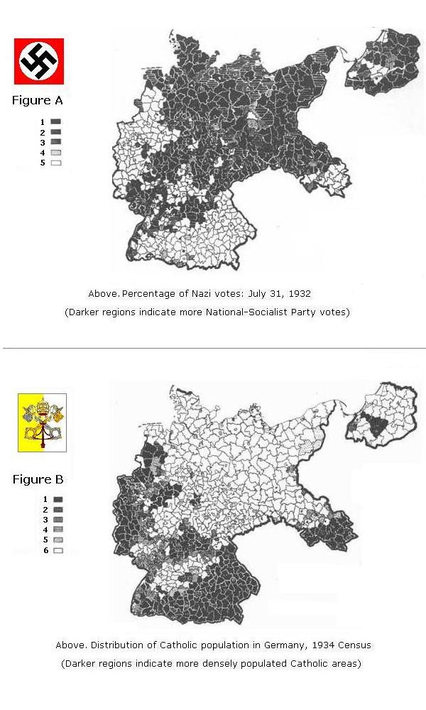The author of the letter explicitly refuses to back up his assertions with historical data, quotes from authoritative historians, or other respected sources. His letter borrows heavily from the webpage of Secular Humanism even to the point of respecting the original’s misspellings! The copy and paste nature of this essay is only one of its minor faults. Intellectual dishonesty comes in many shapes and forms but this is not one of its products. No danger of confusing the author with a “full-time academic” either, not just because of the conspicuous absence of documentation and his frontal contradiction of known history but for his candor in admitting that his writings are a product of his bias. His writings are a mere opinion, a rant against things he dislikes. Don’t bother him with the facts! Please see the illustration and corresponding footnote.[6] Germany: Nazi Vote and Catholic Population Comparison.[7]