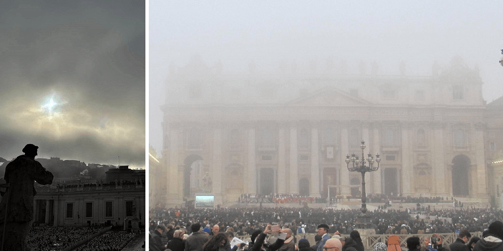 “These last nine years have been studded with extremely suggestive atmospheric phenomena which, in view of faith, would appear as unequivocal manifestations of the Divine. From the lightning that struck the dome of St. Peter on the day of the Declaratio, to the wind that censored Bergoglio when he said that “God is contaminated with sin” HERE the same wind that discovered the papal tiara in the farewell (misunderstood ) by Castelgandolfo HERE, up to the strange luminous cross that appeared in the sky (below, the photo seems authentic ) and the thick fog — completely unusual in Rome — that enveloped St. Peter’s Basilica during the funeral of the Pope.” (Andrea Cionci, Funerali di Benedetto XVI: come papa Ratzinger ha diradato la nebbia)