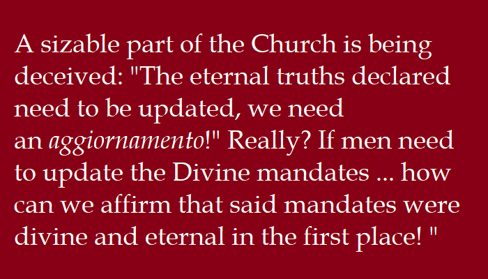 A sizable part of the Church is being deceived: “The eternal truths declared need to be updated, we need an aggiornamento!” Really? If men need to update the Divine mandates … how can we affirm that said mandates were divine and eternal in the first place! ”