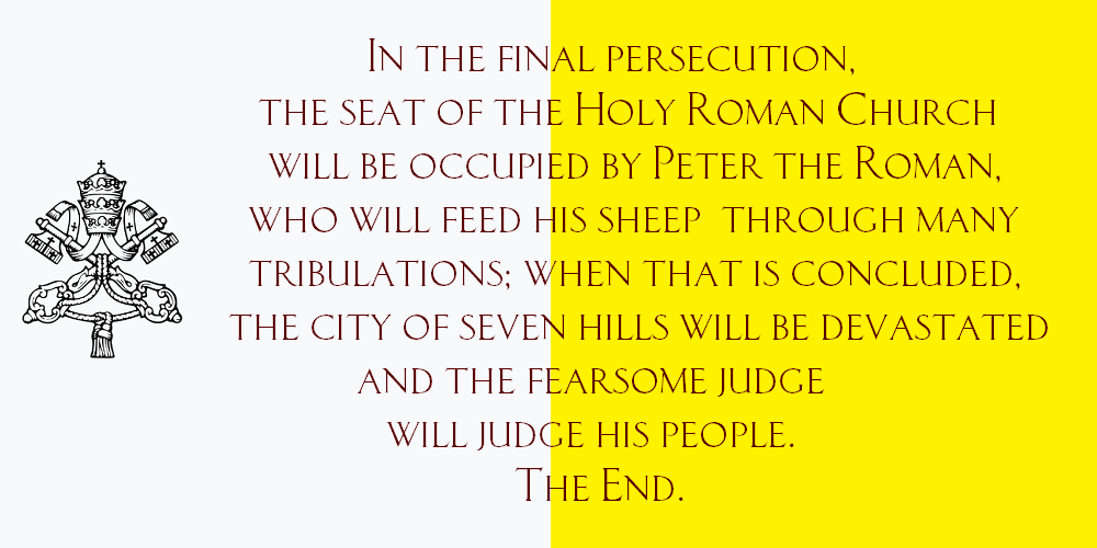 In the final persecution, the seat of the Holy Roman Church will be occupied by Peter the Roman, who will feed his sheep through many tribulations; when that is concluded, the city of seven hills will be devastated, and the fearsome judge will judge his people. The End.